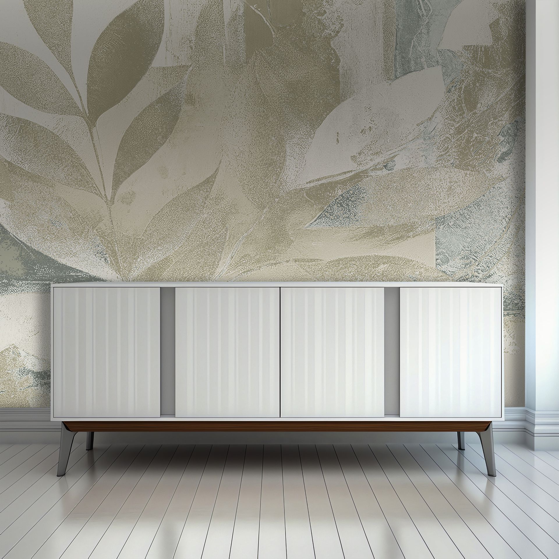 Aggiungi un tocco di lusso e raffinatezza alle tue pareti con la carta da parati Foglia d’Oro grigio, una creazione di design che combina texture materiche e riflessi metallici in modo armonioso e contemporaneo.